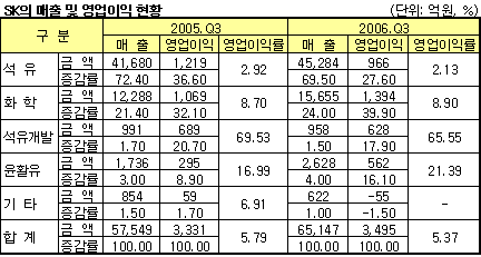 3/4분기 매출 6조5147억원 … 화학ㆍ석유개발 영업이익 2022억원 SK의 3/4분기 화학사업 경영성과가 우수했던 것으로 나타났다.SK는 10월24일 기업설명회를 통해 2006년 3/4분기 매출액과 영업이익이 전년동기대비 13.2%, 4.9% 늘어난 6조5147억원과 3495억원을 기록했다고 밝혔다. 영업이익률은 2005년 3/4분기의 5.8%보다 0.4%p 줄어든 5.4%를 나타냈다. 특히, 매출의 70% 가량을 차지하고 있는 석유사업은 영업이익이 전년동기 1219억원보다 20.7% 하락한 966억원을 기록해 석유사업의 영업이익률은 전체 영업이익률 5.4%의 절반에도 미치지 못하는 2.1%에 불과했다.