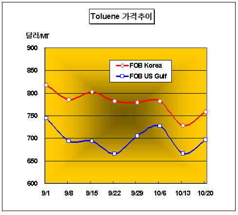 벤젠시장 폭등과 함께 상승세 … Qingdao Lidong 12월 가동 톨루엔(Toluene) 가격은 10월20일 FOB Korea 톤당 757-760달러로 34달러 상승했다.아시아 톨루엔 시장은 국제유가 약세에도 불구하고 벤젠(Benzene)시장 폭등세와 거래 호조에 힘입어 반등에 성공했다. 국제유가는 10월20일 WTI(서부텍사스중질유) 선물가격이 배럴당 59.33달러로 전일대비 1.17달러 하락했고 벤젠은 FOB Korea 톤당 990달러로 130달러 폭등했다. GS그룹 오너 일가 소유의 GS Aromatics, 오만 국영 Oman Oil, Shandong 지방정부 산하 Kailian Group의 60대30대10 합작기업 Qingdao Lidong Chemical의 Aromatics 설비는 12월초 상업가동에 들어간다. 2004년 4월 착공돼 2006년 9월 완공된 Lidong의 생산능력은 벤젠 26만톤, 톨루엔 15만톤, P-X(Para-Xylene) 70만톤, Raffinate 11만3000톤에 이르며 중국시장 공략의 첨병이 될 전망이다. CFR China 가격은 톤당 765-767달러, CFR SE Asia는 톤당 780-785달러를 형성했으며 중국 내수가격은 ex-Tank 톤당 7750-7800위안에 마감됐다.