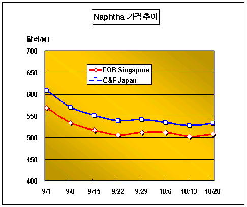 표, 그래프: | Naphtha 가격추이 | <화학저널 2006/10/25> |