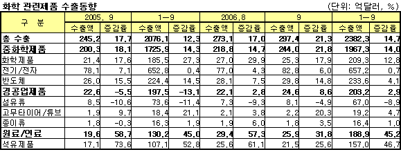 중화학공업제품은 21.8% 증가한 244억달러를 기록했는데 선박이 21.9% 감소한 반면, 화학제품이 17.9% 증가한 25억3000만달러, 정보통신기기가 3.7% 증가한 41억9000만달러를 기록해 증가세가 둔화됐으나 기계류와 정밀기기, 반도체 등의 증가세가 확대됐다. 경공업제품은 8.6% 증가한 24억6000만달러를 기록했다. 종이류가 3.5% 증가한 1억8000만달러에 그쳐 증가세가 둔화됐으나, 고무타이어 및 튜브가 20.3% 증가한 2억2000만달러를 기록해 증가세가 크게 확대됐고, 섬유류는 4.9% 줄어든 8억1000만달러로로 감소세가 둔화됐다. 원료 및 연료는 31.8% 증가한 25억9000만달러에 달했는데 석유제품이 25.6% 증가한 21억5000만달러에 그쳐 증가세가 둔화됐다. 일본에 대한 수출은 16.6%, 미국이 8.4%, 중국이 15.2% 증가해 8월과 비슷한 증가세를 보인 반면, 중남미가 58.5%, EU가 27.1%, 동남아가 26.3%, 중동이 25.7% 늘어 증가세가 확대됐다. <김지은 기자> 표, 그래프: | 화학 관련제품의 수출동향 | <화학저널 2006/10/27> |