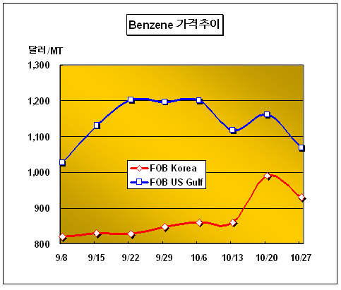 전주 130달러 폭등 후 60달러 급락 … 중국 신규설비 가동 임박 벤젠(Benzene) 가격은 10월27일 FOB Korea 톤당 929-931달러로 60달러 급락했다.아시아 벤젠 시장은 국제유가 약세와 미국시장 폭락세 및 중국 신규 생산설비의 가동이 임박함에 따라 급락장을 형성했다. 두바이유 현물가격은 10월27일 배럴당 56.73달러로 전일대비 1.03달러 하락했으며 중국 Qingdao Lidong Chemical의 Aromatics 설비는 12월초 상업가동에 들어갈 예정이다. GS Aromatics, Oman Oil, Shandong 지방정부 산하 Kailian Group의 60대30대10 합작기업인 Qingdao Lidong의 생산능력은 벤젠 26만톤, 톨루엔(Toluene) 15만톤, P-X(Para-Xylene) 70만톤, Raffinate 11만3000톤으로 파악되고 있다. Sinopec Dongxing의 Guangdong, Zhanjiang 소재 500만톤 정유공장 내에 위치한 벤젠 15만톤 추출 설비는 2006년 말 완공돼 2007년 1/4분기 가동에 돌입할 계획이다. FOB SE Asia 가격은 톤당 919-921달러, CFR Taiwan 가격은 톤당 951-953달러에 마감됐다. ExxonMobil의 싱가폴 Jurong Island 소재 Reformer는 10월9일 정전으로 가동이 중단됐다가 10월19일 재가동에 들어간 것으로 알려졌다.
