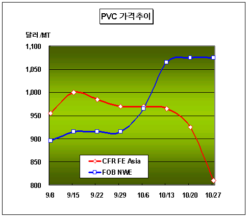 CFR FE Asia 톤당 810달러 형성 … LG화학 IBSA 시장공략 박차 PVC(Polyvinyl Chloride) 가격은 10월25일 CFR FE Asia 톤당 805-815달러로 115달러 폭락했다.아시아 PVC 시장은 에틸렌(Ethylene) 약세와 중국시장 수요 급감에 따라 순식간에 톤당 900달러대가 무너졌다. 에틸렌은 10월27일 FOB Korea 톤당 1105달러로 보합세를 유지했고 중국 내수가격은 에틸렌 베이스 PVC가 톤당 7300-7700위안으로 200위안 폭락했다. 중국 생산기업들이 선호하고 있는 카바이드(Carbide) 베이스 제품도 톤당 6600-6700위안으로 300위안 폭락해 시장약세를 견인했다. LG그룹은 LG화학과 LG전자를 주축으로 IBSA(인디아, 브라질, 남아프리카) 시장공략에 주력하고 있으며 LG화학은 PVC 및 ABS(Acrylonitrile Butadiene Styrene) 등 주력제품의 현지화를 적극 추진하고 있는 것으로 알려졌다.