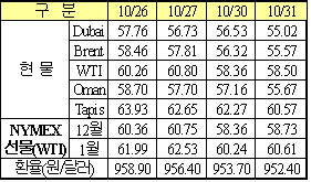 10월31일 55.02달러로 1.51달러 급락 … Brent유 하락에 WTI 상승 두바이(Dubai)유 가격이 급락했다.한국석유공사에 따르면, 10월31일 거래된 중동산 두바이유 현물가격은 배럴당 55.02달러로 전날보다 1.51달러 하락했다. Brent유 현물가격은 배럴당 0.75달러 하락한 55.57달러를 형성했고, WTI(서부텍사스 중질유) 현물가격은 배럴당 0.14달러 상승한 58.50달러에 거래됐다. NYMEX(뉴욕상업거래소) WTI 선물유가는 배럴당 0.37달러 상승한 58.73달러, IPE(영국 국제석유거래소) Brent 선물유가는 배럴당 0.35달러 상승한 59.03달러에 거래가 종료됐다.