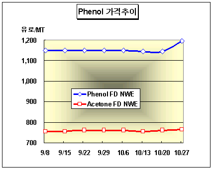 FD NWE 톤당 1195유로 형성 … 프랑스 생산설비 가동중단 페놀(Phenol) 가격은 10월24일 FD NWE 톤당 1190-1200유로로 50유로 급등했다.유럽 페놀시장은 프랑스 소재 페놀 생산설비의 가동중단 소식과 BPA(Bisphenol-A) 부문의 수요 호조에 힘입어 급등장을 형성했다. 터키 수요기업은 11월 초순 인도분 500톤 Cargo를 FOB Rotterdam 톤당 1350-1400달러에 구매하기도 했지만 페놀 FOB Rotterdam 가격은 10월24일 톤당 1295달러로 보합세를 유지했다. 아세톤은 FD NWE 톤당 765유로로 5유로 상승했으며 FOB Rotterdam 가격은 톤당 610달러로 10달러 하락했다.