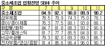 중기중앙회, 화합물ㆍ화학 90.9로 2.3p 하락 … 고무ㆍ플래스틱 91.9 중소 화학기업들은 11월 경기가 소폭 하락할 것으로 전망했다.중소기업중앙회가 중소제조업 1500사를 대상으로 실시한 <중소기업경기전망 조사 결과>에 따르면, 2006년 11월 중소제조업 업황전망 SBHI는 90.2로 10월(89.9)에 비해 소폭 상승했으나 기준치를 밑돌아 업황회복이 어려울 것으로 전망됐다.