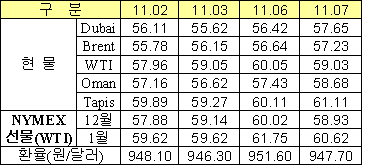 | 11월7일 57.65달러로 1.23달러 올라 … WTI 선물은 1.09달러 하락두바이(Dubai)유 가격이 상승세를 타고 있다. 한국석유공사에 따르면, 11월7일 거래된 중동산 두바이유 현물가격은 배럴당 57.65달러로 전일대비 1.23달러 상승했다. Brent유 현물가격은 배럴당 0.59달러 상승한 57.23달러를 형성했고, WTI(서부텍사스 중질유) 현물가격은 배럴당 1.02달러 내린 59.03달러에 거래됐다. NYMEX(뉴욕상업거래소) WTI 선물유가는 배럴당 1.09달러 하락한 58.93달러, ICE(영국 국제석유거래소) Brent 선물유가는 배럴당 1.27달러 하락한 58.48달러에 거래가 종료됐다.