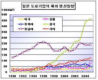 2005년 103만149톤 사상 최고 … 중국 신장 둔화에 인디아 급증세 일본 도료기업들의 해외 생산량이 사상 최초로 100만톤대를 돌파했다.2005년 생산이 103만톤을 기록해 전년대비 10.8% 증가했는데 1999년 51만톤에 비해 6년간 2배로 확대됐다.