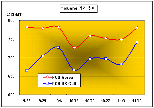 FOB Korea 톤당 31달러 상승 … ShellㆍBP 줄줄이 가동 중단 톨루엔(Toluene) 가격은 11월10일 FOB Korea 톤당 779-781달러로 31달러 상승했다.아시아 톨루엔 시장은 국제유가 약세에도 불구하고 미국 주요 설비의 트러블에 따른 수출 증가에 힘입어 급반등에 성공했다. WTI 선물가격은 11월10일 배럴당 59.59달러로 전일대비 1.57달러 하락했으며 Shell의 텍사스 Deer Park 소재 일산 33만3700배럴 정유공장 내 일산 6만7500배럴 FCC(Fluid Catalytic Cracker)는 11월4일 가동중단된 것으로 알려졌다. BP의 텍사스 Texas City 소재 Aromatics 설비 2기 중 1기는 가동중단된 상태로 조만간 재가동에 들어갈 예정이며 나머지 1기의 가동률도 감축된 것으로 파악되고 있다. CFR China 가격은 톤당 804-806달러, CFR SE Asia는 톤당 810-812달러를 형성했으며 중국 내수가격은 ex-Tank 톤당 7825-7875위안에 마감됐다.