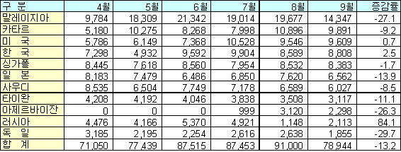 9월 8808톤으로 2.5% 증가 그쳐 … 1위 말레이는 27.1% 급감 국산 LDPE(Low-Density Polyethylene)가 중국 수입시장 4위로 하락했다.국산 LDPE 수출량은 9월 8808톤으로 2.5% 증가했으나 말레이지아, 카타르, 미국에 밀렸으며 8-9월 9000톤대 수출량을 달성하지 못한 것으로 나타났다. 말레이지아산 수입량은 27.1% 급감했지만 1만4347톤으로 1위를 고수했으며 카타르는 9.2% 감소해 미국과의 격차가 더욱 줄어들었다. 아제르바이잔은 4-6월 0톤에서 7월 999톤을 거쳐 9월 2298톤으로 증가해 신흥 수입국의 입지를 다지고 있으며 러시아는 2113톤으로 84.1% 급증해 저력을 과시하고 있다.