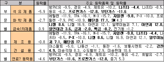 제조용은 니켈, 아연괴, 메탄올(Methanol) 등이 올랐으나 국제유가 하락의 영향으로 에틸렌, 나프타 등 대다수 석유화학제품이 내림세를 보여 0.8% 하락했다. 표, 그래프: | 중간재 물가동향 | <화학저널 2006/11/17> |