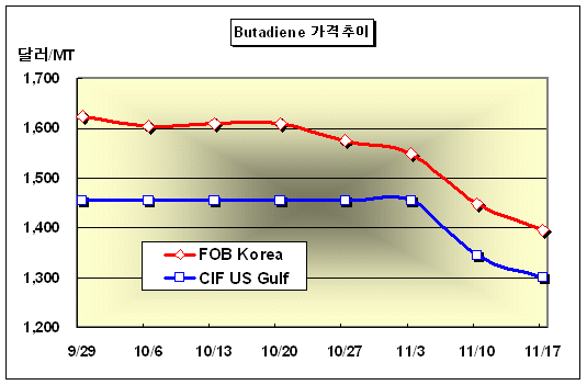 부타디엔(Butadiene) 가격은 11월17일 FOB Korea 톤당 1390-1400달러로 55달러 급락했다.