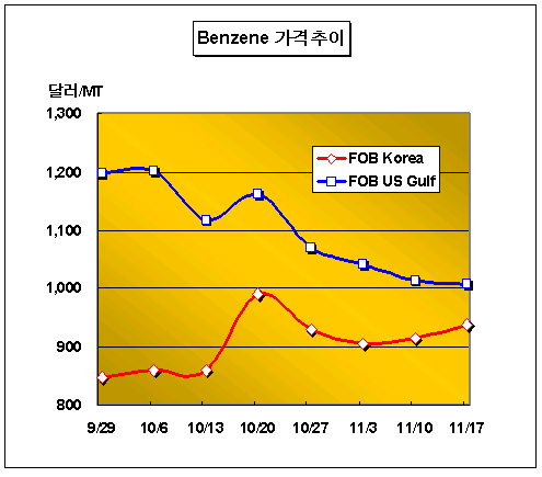 FOB Korea 톤당 938달러 형성 … 국내기업은 2007년 계약가격 협상 벤젠(Benzene) 가격은 11월17일 FOB Korea 톤당 937-938달러로 23달러 상승했다.아시아 벤젠 시장은 국제유가 약세에도 불구하고 타이 IRPC Public의 정기보수에 힘입어 950달러대 진입을 노리고 있다. 국제유가는 11월17일 WTI 선물가격이 배럴당 55.81달러로 전일대비 0.45달러, 두바이유 현물가격은 배럴당 55.35달러로 1.79달러 급락했다. 타이 IRPC의 Map Ta Phut 소재 Aromatics 설비는 11월15일부터 12월5일까지의 일정으로 정기보수에 들어갔으며 생산능력은 벤젠 11만4000톤, 톨루엔(Toluene) 13만톤, M-X(Mixed-Xylene) 12만톤으로 나타났다. 국내 벤젠 생산기업들은 지역 수요기업들과 2007년 계약거래 협상을 시작했는데 계약가격(CP) Formula에 대해 생산기업들은 MOPK(Means of Platt's Korea)에 톤당 8달러의 프리미엄을, 수요기업들은 톤당 2달러의 디스카운트를 요구한 것으로 알려졌다. FOB SE Asia 가격은 톤당 927-928달러, CFR Taiwan 가격은 톤당 961-962달러에 마감됐다.