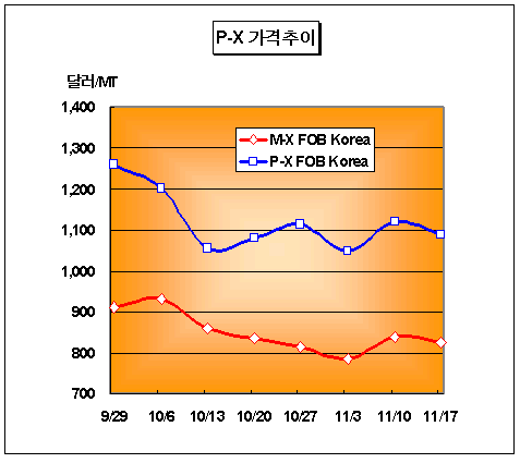 FOB Korea 톤당 1090달러 형성 … 12월 CP는 100달러 이상 폭등 P-X(Para-Xylene) 가격은 11월17일 FOB Korea 톤당 1089-1091달러로 30달러 하락했다.아시아 P-X 시장은 업스트림인 M-X(Mixed-Xylene) 약세와 중국의 수요 부진에 따라 전주의 급등세를 이어가지 못했다. M-X 가격은 11월17일 FOB Korea 톤당 825달러로 15달러 하락했으며 P-X와의 스프레드는 전주 톤당 280달러에서 톤당 265달러로 축소됐다. 다만, 폭등조짐을 나타내고 있는 12월 아시아 계약가격(CP)이 변수가 될 예정인데 ExxonMobil은 CFR Asia 톤당 1150달러, Idemitsu는 톤당 1140달러, Nippon Oil은 톤당 1110달러, Japan Energy는 톤당 1120달러로 각각 전월대비 110-150달러 인상할 것으로 알려졌다. 타이 Thai Paraxylene의 Sri Racha 소재 P-X 35만톤 설비는 12월15일부터 4-5일간, 말레이지아 Aromatics Malaysia의 Kertih 소재 55만톤 설비는 2007년 4월 40일간의 정기보수를 계획하고 있다.