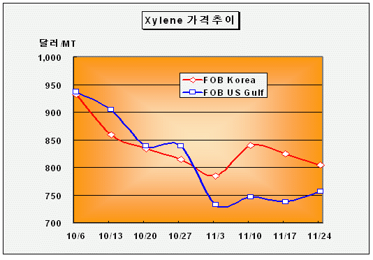 FOB Korea 톤당 805달러 형성 … 인디아 MRPL 25만톤 가동 임박 자일렌(Xylene) 가격은 11월24일 FOB Korea 톤당 804-806달러로 20달러 하락했다.아시아 자일렌 시장은 국제유가 약세와 다운스트림인 P-X(Para-Xylene) 부문의 수요 부진에 따라 800달러대 붕괴 위기에 처했다. 국제유가는 11월23일 추수감사절 연휴로 뉴욕상업거래소(NYMEX)가 휴장한 가운데 두바이유 현물가격이 배럴당 55.90달러로 0.72달러 하락했다. P-X 가격은 FOB Korea 톤당 1079-1081달러로 10달러 하락했으며 인디아 Reliance Industries의 Jamnagar 소재 P-X 플랜트 1기는 11월21일부터 2007년 1월초까지 정기보수에 돌입한 것으로 알려졌다. 인디아 MRPL(Mangalore Refinery & Petrochemicals)의 Mangalore 소재 정유공장 내 M-X(Mixed-Xylene) 25만톤 설비는 2007년 1월초 신규가동에 들어갈 것으로 파악되고 있다.
