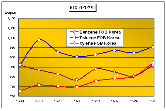 톨루엔 67달러에 자일렌 55달러 급등 … GS칼텍스 유지보수 3-5일 BTX 가격이 오랜만에 상승가도를 탔다.국제유가 강세와 GS칼텍스의 가동중단에 따른 것으로 벤젠(Benzene) 가격은 12월1일 FOB Korea 톤당 955달러로 31달러 상승했고 톨루엔(Toluene)은 톤당 870달러로 67달러, 자일렌(Xylene)은 톤당 860달러로 55달러 급등했다. 국제유가는 12월1일 WTI 선물가격이 배럴당 63.43달러로 전일대비 0.30달러, 두바이유 현물가격은 배럴당 60.23달러로 1.42달러 상승했다. GS칼텍스의 여수 소재 No.2 벤젠-톨루엔 Extraction Unit은 12월1일 오전 트러블에 따라 가동이 중단됐으며 긴급 유지보수에 들어가 재가동에 3-5일이 소요될 것으로 알려졌다. 설비의 생산능력은 벤젠 10만톤, 톨루엔 35만톤으로 파악되며 가동중단에 따라 GS칼텍스는 BTX 구매도 고려하고 있는 것으로 파악되고 있다.