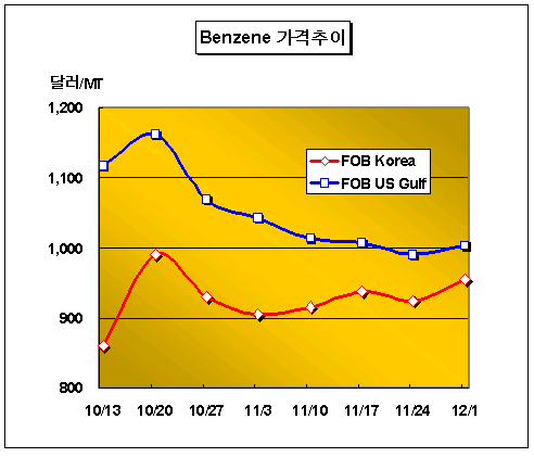 FOB Korea 톤당 31달러 상승 … GS는 벤젠 10만톤 플랜트 유지보수 벤젠(Benzene) 가격은 12월1일 FOB Korea 톤당 954-956달러로 31달러 상승했다.아시아 벤젠 시장은 국제유가 및 나프타(Naphtha) 강세와 GS칼텍스의 여수공장 트러블에 따라 반등에 성공했다. 국제유가는 12월1일 WTI 선물가격이 배럴당 63.43달러로 전일대비 0.30달러, 두바이유 현물가격은 배럴당 60.23달러로 1.42달러 상승했고 나프타는 C&F Japan 톤당 583달러로 45달러 급등했다. GS칼텍스의 여수 소재 No.2 벤젠 10만톤/톨루엔(Toluene) 35만톤 Extraction Unit은 12월1일 오전 트러블에 따라 가동이 중단됐으며 긴급 유지보수에 들어가 재가동에 3-5일이 소요될 것으로 알려졌다. 일본 Nippon Oil은 아시아 12월 벤젠 계약가격(CP)을 CFR Asia 톤당 935달러로 확정해 전월대비 25달러 인상한 것으로 나타났다. FOB SE Asia 가격은 톤당 939-940달러, CFR Taiwan은 톤당 979-981달러에 마감됐다.