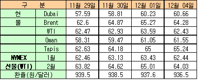12월4일 WTIㆍBrent 1달러 안팎 떨어져 … Dubai유는 상승 12월4일 국제유가는 미국 국립기상청의 미국 전지역 기온상승 예보와 OPEC의 추가감산에 대한 시장의 회의적 반응 영향으로 하락했다.한국석유공사에 따르면, 뉴욕상업거래소(NYMEX)의 WTI(서부텍사스 중질유) 선물유가는 전일대비 배럴당 0.99달러 하락한 62.44달러에, ICE의 Brent 선물유가는 1.17달러 하락한 63.45달러에 거래가 종료됐다. 반면, Dubai 현물유가는 0.43달러 상승한 60.66달러를 형성했다.
