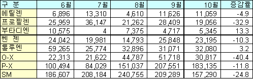 SM(Styrene Monomer) 또한 24.8% 급감한 15만7290톤을 형성했으나 톨루엔(Toluene)은 3만2080톤으로 3.2% 증가했다. 표, 그래프: | 중국의 기초유분 수입현황(2006) | <화학저널 2006/12/05> |