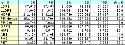 10월 LDPEㆍHDPE 수입 30%대 급감 … 신규설비 가동 봇물 따라 중국의 합성수지 수입이 눈에 띄게 감소하고 있다.LDPE(Low-Density Polyethylene) 수입은 10월 5만4054톤으로 31.5%, HDPE(High-Density PE)는 13만7197톤으로 31.6% 급감했으며 LLDPE(Linear LDPE)도 26.9%의 감소세를 기록했다. PP(Polypropylene) Homopolymer와 HIPS(High-Impact Polystyrene)는 각각 20.2%, 20.1% 급감했으며 PP Copolymer와 GPPS(General Purpose PS)는 한자릿수 감소율에 그쳤다. PET(Polyethylene Terephthalate)는 9933톤으로 무려 65.4% 급감했으며 PVC(Polyvinyl Chloride)는 8만3283톤으로 18.7% 감소했다.
