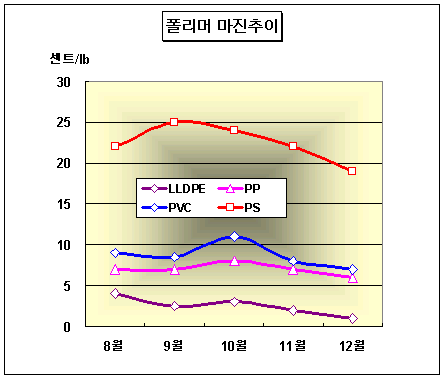 PS(Polystyrene)는 월등한 마진폭을 보여줬는데 8월 파운드당 22센트에서 9월 25센트, 10월 24센트, 11월 22센트를 기록했으나 12월에는 19센트로 주춤할 전망이다. 표, 그래프: | 폴리머마진추이 | <화학저널 2006/12/08> |