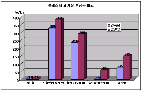 규개위는 폐플래스틱을 처리하는 실비 기준으로 환경부와 업계의 의견을 반영해 요율을 산정한 것으로 알려졌다. 실처리비 산정을 두고 대립한 항목은 인건비로, 환경부는 1인당 인건비로 공무원 임금 기준으로 연간 3000만원을 반영한 반면 플래스틱은 위탁기업 기준으로 1200만원을 주장했다. 규개위는 폐기물 처리의 위탁과 직영비율을 감안해 인건비를 2000만원으로 책정해 요율에 반영했다. 규개위는 또 종량제 봉투 비용 차감 등 업계의 주장을 일부 수용해 당초 환경부안의 40% 수준으로 최종 요율을 결정했다. 그러나 중소 플래스틱기업들은 규개위 중재안도 중소기업들이 감당할만한 요율이 아니라며 반발하고 있다. 프라스틱조합연합회가 최근 회원사를 대상으로 실시한 조사에 따르면, 부담금 인상으로 가공기업들이 손익분기점에 도달하는 수준은 평균 kg당 65원으로 중재안은 일반용이 훨씬 높은 150원이기 때문에 재생원료 사용이나 부담금의 제품가격 반영 등을 하지 못하는 가공기업들은 손실을 볼 수밖에 없다는 주장이다. 중소기업중앙회 관계자는 “치열한 시장경쟁으로 부담금을 제품가격에 반영하지 못하거나 품목특성상 부담금 제외대상인 재생원료를 사용하지 못하는 중소기업들의 피해가 클 것”이라고 말했다. PE(Polyethylene) 수도·하수관을 만드는 J사는 “품질문제로 수도관에는 재생원료를 사용할 수 없다”며 “부담금이 과도하게 인상되면 주철관 등 대체제품을 만드는 곳과의 경쟁에서 밀릴 수밖에 없다”고 주장했다. 표, 그래프: | 플래스틱 폐기물 부담금 비교 | <화학저널 2006/12/11> |