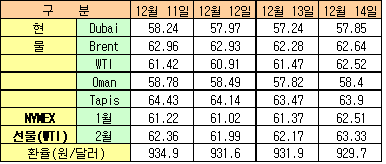 12월14일 WTI 1.14달러 올라 62.51달러 형성 … Dubai유도 57.85달러 12월14일 국제유가는 OPEC(석유수출국구기)의 50만b/d 추가감산과 미국의 석유 재고 감소가 뒤늦게 시장에 반영되면서 상승했다.한국석유공사에 따르면, 뉴욕상업거래소(NYMEX)의 WTI(서부텍사스 중질유) 선물유가는 전일대비 배럴당 1.14달러 상승한 62.51달러에, ICE의 Brent 선물유가는 0.79달러 상승한 62.12달러에 거래가 종료됐다. Dubai 현물유가도 0.61달러 상승한 57.85달러를 형성했다.