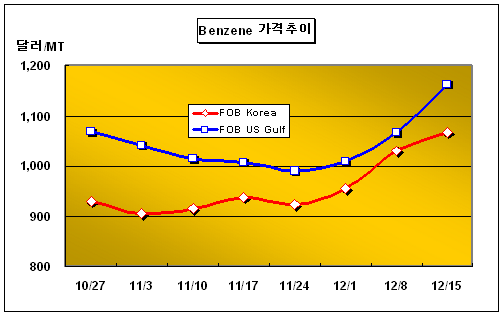 FOB Korea 1068달러로 38달러 상승 … 미국시장은 96달러 폭등 벤젠(Benzene) 가격은 12월15일 FOB Korea 톤당 1065-1070달러로 38달러 상승했다.아시아 벤젠 시장은 국제유가 강세와 Valero의 정유공장 화재에 따른 미국시장 폭등세에 힘입어 상승세를 이어갔다. 국제유가는 12월15일 WTI 선물가격이 배럴당 63.43달러로 전일대비 0.92달러, 두바이유 현물가격은 배럴당 59.18달러로 1.33달러 상승했다. Valero의 텍사스 Texas City 소재 정유공장 화재는 12월11일 오후 발생했으며 정제능력은 일일 20만4250배럴, FCC(Fluid Catalytic Cracker) 생산능력은 일일 8만배럴, Solvent Fuel 생산능력은 일일 3만5000배럴, Reformer 생산능력은 일일 1만4500배럴로 파악되고 있다. 화재로 가동중단된 타이완 FCFC(Formosa Chemical & Fibre)의 Mai Liao 소재 벤젠 35만톤 규모의 No.2 Aromatics 설비는 12월20일부터 상업생산을 재개한다. 촉매 문제로 가동중단된 중국 Yangzi Petrochemical의 10만톤 규모의 TDP(Toluene Disproportionation) 설비는 12월14일 재가동에 들어갔다. FOB SE Asia 가격은 톤당 1050-1055달러, CFR Taiwan은 톤당 1090-1095달러에 마감됐다.