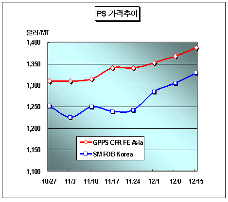 CFR FE Asia 톤당 1383달러 형성 … 업스트림 부문도 상승가도 GPPS(General Purpose Polystyrene) 가격은 12월13일 CFR FE Asia 톤당 1385-1390달러로 20달러 상승했다.아시아 PS 시장은 업스트림인 벤젠(Benzene) 및 SM(Styrene Monomer) 가격강세와 중국수요 호조에 힘입어 1400달러대 진입을 꾀하고 있다. 벤젠 가격은 12월15일 FOB Korea 톤당 1068달러로 38달러 상승했고 SM은 FOB Korea 톤당 1329달러로 24달러 상승했다. 인디아 Shin Ho Petrochemicals은 2007년 4월까지 EPS(Expandable PS) 생산능력을 6000톤에서 1만5000톤으로 확장할 계획이다. HIPS(High-Impact PS) 가격은 CFR FE Asia 톤당 1435-1440달러로 30달러 상승했다.