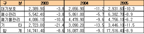 한국은행 관계자는 “우리나라 환경보호지출은 선진국과 비슷한 수준”이라면서도 “그렇다고 선진국과 환경보호의 질적 수준이 비슷하다는 의미는 아니다”라고 강조했다. 표, 그래프: | 환경보호비용 지출동향 | <화학저널 2006/12/20> |