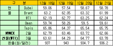 12월21일 58.78달러로 0.11달러 올라 … WTIㆍBrent유는 크게 하락 12월21일 국제유가는 온화한 기온 예보와 연휴를 앞둔 차익실현 매물 출회로 하락했다.한국석유공사에 따르면, 뉴욕상업거래소(NYMEX)의 WTI(서부텍사스 중질유) 선물유가는 전일대비 배럴당 1.06달러 하락한 62.66달러에, ICE의 Brent 선물유가는 0.77달러 하락한 62.46달러에 거래를 종료했다. 반면, Dubai 현물유가는 0.11달러 상승한 58.78달러를 형성했다.