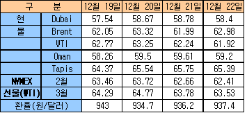 12월22일 Dubai유 58.40달러로 하락 … WTIㆍBrent도 약세 12월22일 국제유가는 온화한 기온 예보와 미국의 석유 재고증가 기대, 연휴를 앞둔 차익실현 매물 출회로 하락했다.한국석유공사에 따르면, 뉴욕상업거래소(NYMEX)의 WTI(서부텍사스 중질유) 선물유가는 전일대비 배럴당 0.25달러 하락한 62.41달러에, ICE의 Brent 선물유가는 0.04달러 하락한 62.42달러에 거래가 종료됐다. Dubai 현물유가도 0.38달러 하락한 58.40달러를 형성했다.
