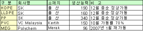 Merak 소재 No.1 9만6000톤 플랜트는 9월15일 마진 악화에 따라 가동을 중단했으며 신규 석탄 보일러 설치를 마친 이후 가동을 재개할 것으로 알려졌다. No.2 12만톤 설비는 마진 악화에도 정상 가동률을 유지하고 있으나 중국수출 전략에는 다소 차질이 생긴 것으로 평가되고 있다. 표, 그래프: | 주요 설비의 가동현황(2006) | <화학저널 2006/12/23> |