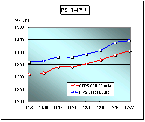 CFR FE Asia 1405달러로 17달러 상승 … Dow Europe은 70유로 인상 GPPS(General Purpose Polystyrene) 가격은 12월20일 CFR FE Asia 톤당 1400-1410달러로 17달러 상승했다.아시아 PS 시장은 업스트림인 벤젠(Benzene) 및 SM(Styrene Monomer) 가격하락에도 불구하고 거래 호조에 힘입어 1400달러대 진입에 성공했다. 벤젠 가격은 12월22일 FOB Korea 톤당 1045달러로 23달러, SM은 FOB Korea 톤당 1300달러로 29달러 하락했다. HIPS(High-Impact PS) 가격은 CFR FE Asia 톤당 1440-1450달러로 7달러 상승했으며 Dow Europe은 2007년 1월1일부로 PS 브랜드 Styron에 대한 유럽지역 판매가격을 톤당 70유로 인상할 예정이다. BASF는 12월 GMP(Gross Market Price)를 FD NWE 톤당 1375유로로 고시해 12월4일 고시가격 대비 10유로 인하했다.