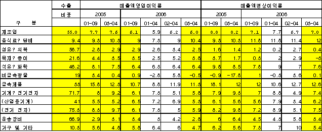 한국은행, 2006년 1-9월 7.8% 불과 … 음식료ㆍ금속제품은 양호 한국은행이 1520개 상장ㆍ등록기업을 대상으로 조사해 12월14일 발표한 <3/4분기 기업경영분석 결과>에 따르면, 2006년 3/4분기 제조업의 매출액영업이익률은 6.0%로 2/4분기 6.2%에 비해 소폭 하락했으나 매출액경상이익률은 6.7%에서 7.0%로 0.3%p 상승했다.수출기업은 원화환율의 안정과 수출 호조로 매출액영업이익률이 5.0%에서 5.1%로, 매출액경상이익률은 6.1%에서 6.5%로 모두 2/4분기보다 상승했다. 반면, 내수기업은 원자재 가격 상승 및 판매가격 하락 등으로 2/4분기에 비해 매출액영업이익률이 7.8%에서 7.3%로 하락했으나 지분법 평가이익(순) 증가 등 영업외수지 개선으로 매출액경상이익률은 7.6%에서 7.8%로 상승했다. 수익성은 하락 업종이 우세했는데, 섬유ㆍ의복은 매출부진, 목재ㆍ종이와 금속제품은 원재료가격 상승, 비금속광물은 판매가격 하락, 운송장비는 자동차 파업 등의 요인으로 매출액영업이익률과 경상이익률이 모두 2/4분기보다 하락했다. 산업용 기계는 매출부진으로 매출액영업이익률이 2/4분기에 비해 하락한 반면, 지분법 평가이익(순) 증가 등으로 매출액경상이익률은 상승했다.
