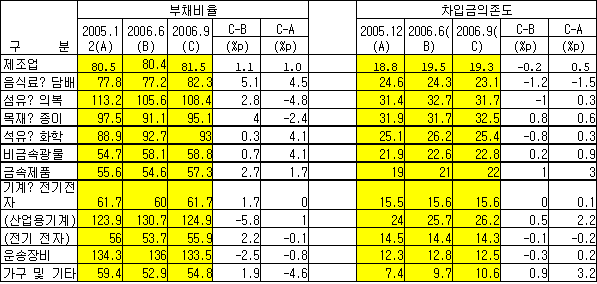 한국은행, 2005년말 88.9% 비해 4.1%p 올라 … 전기전자는 56% 불과 한국은행이 1520개 상장ㆍ등록기업을 대상으로 조사해 12월14일 발표한 <3/4분기 기업경영분석 결과>에 따르면, 2006년 9월말 현재 제조업의 부채비율은 81.5%로 6월말(80.4%)에 비해 1.1%p 소폭 상승했다.제조업의 부채비율이 상승한 것은 매입채무 및 미지급금 등 비차입성 부채 외에 차입금도 증가한 데 기인한 것으로 해석된다. 차입금의존도는 6월말 19.5%에서 9월말 19.3%로 하락했는데, 차입금보다 비차입성 부채가 더 큰 폭으로 증가했기 때문이다. 부채비율이 400%를 초과하는 부채과다기업(자본잠식 포함)의 비중은 3.3%로 6월말과 비슷한 수준을 나타냈다. 부채비율이 상승한 업종이 대부분이고 하락업종은 2개에 그친 반면, 차입금의존도는 하락한 업종이 5개에 달했다.