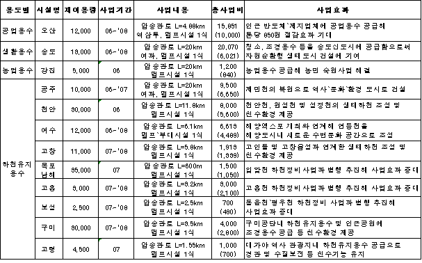 환경부, 고도 처리공정 도입 … 저렴한 용수 공급 수생태계 회복 기대 2008년까지 하수처리수가 재이용돼 연간 6100만톤의 용수가 공급된다.환경부는 그동안 하천에 방류하던 하수처리장 방류수(하수처리수)를 공업용수·농업용수·생활용수 및 하천유지용수 등으로 재이용하기 위해 2008년까지 733억원을 투자해 연간 6100만톤의 용수를 공급할 계획이라고 밝혔다. 하수처리수는 오산, 송도, 강진에서 각각 공업용수, 생활용수, 농업용수로 재이용되며 공주, 천안 등 10 곳에서 하천유지용수로 재이용된다.