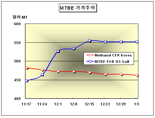 FOB Singapore 575달러로 13달러 하락 … 메탄올 시장도 하락세 MTBE 가격은 1월5일 FOB Singapore 톤당 574-576달러로 12.5달러 하락했다.아시아 MTBE(Methyl Tertiary Butyl Ether) 시장은 국제유가 약세와 2007년 일본의 ETBE(Ethyl Tert Butyl Ether) 대체 움직임에 하락세를 면치 못했다. 국제유가는 1월5일 WTI 선물가격이 배럴당 56.31달러로 전일대비 0.72달러 상승했으나 두바이유 현물가격은 배럴당 52.41달러로 2.95달러 급락했다. 일본 PAJ(Petroleum Association of Japan)는 1월27일 ETBE 수입을 위한 합작기업을 발족하며 18개 회원사가 지분을 보유할 예정이다. 합작기업은 3월 프랑스로부터 ETBE 수입을 시작해 Nippon Oil의 Negishi 소재 일일 34만배럴 정유공장에서 휘발유와 혼합하며 ETBE 혼합 휘발유는 동부 Kanto 지역의 50개 주유소에서 4월27일부터 시판될 것으로 알려졌다. 미국시장의 MTBE 가격은 1월5일 톤당 552달러로 보합세를 유지했다.