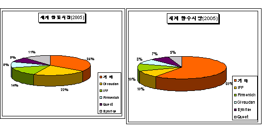 특히, 아시아ㆍ태평양 지역에서는 2005년 매출의 27%를 올렸으며 중국시장 공략에 최선을 다하고 있다. 표, 그래프: | 세계 향료시장(2005) | 세계 향수시장(2005) | <화학저널 2007/01/08> |
