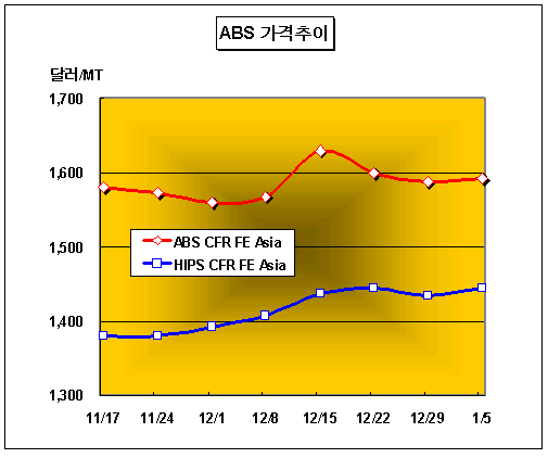 CFR FE Asia 1593달러로 5달러 상승 … 주요 설비 정기보수 일단락 ABS 가격은 1월3일 CFR FE Asia 톤당 1590-1595달러로 5달러 상승했다.아시아 ABS(Acrylonitrile Butadiene Styrene) 시장은 업스트림인 부타디엔 가격하락에도 불구하고 소폭 상승해 1600달러 재진입을 노리고 있다. 부타디엔 가격은 1월5일 FOB Korea 톤당 1125달러로 10달러 하락했으나 SM(Styrene Monomer)은 FOB Korea 톤당 1315달러로 5달러 상승했다. 주요 생산기업들의 정기보수는 2006년 12월말 일단락됐는데 일본 Toray Industries의 Butterworth 소재 ABS 22만톤 설비는 11월22일부터 4주간의 정기보수를 실시했으며 타이 IRPC의 Map Ta Phut 소재 9만6000톤 설비도 12월말 정기보수를 마무리한 것으로 알려졌다.
