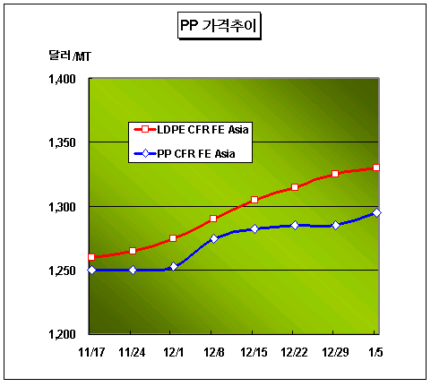 PP는 CFR FE Asia 톤당 1295달러 … 카르텔 과징금 수위에 촉각 PP 가격은 1월3일 Raffia/Injection 그레이드 기준 CFR FE Asia 톤당 1290-1300달러로 10달러 상승했다.아시아 PP(Polypropylene) 시장은 업스트림인 프로필렌(Propylene) 가격상승과 거래 호조에 따라 1300달러대 입성을 꾀하고 있다. 프로필렌은 1월5일 FOB Korea 톤당 1155달러로 20달러 상승했으며 PP Block Copolymer 그레이드는 CFR FE Asia 톤당 1335-1340달러로 18달러 상승했다. 공정거래위원회는 1월 중으로 석유화학기업들의 10여년에 걸친 PP 및 HDPE(High-Density Polyethylene) 카르텔 시행에 대한 과징금 부과 조치를 단행할 예정으로 시장의 관심이 쏠리고 있다. 다만, 총 2000억원대로 예상되는 과징금 수위에 대해 해당기업들이 이의제기를 검토하고 있어 귀추가 주목되고 있다.