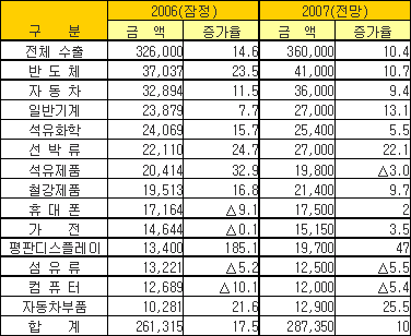산자부, 2007년 254억달러에 그칠 전망 … 석유제품은 3.0% 감소 2007년 수출은 세계경기, 환율 등 대외여건이 다소 어려우나 10% 초반대의 증가세로 5년 연속 2자릿수 증가율이 예상된다.산업자원부에 따르면, 2007년에는 선박(22.1%), 자동차ㆍ자동차부품(13.3%), 반도체(10.7%) 수출이 10% 이상 증가하고 휴대폰(2.0%), 가전(3.5%)은 BRICs 등 신흥시장 성장 및 선진국 시장 교체수요 등으로 점진적인 수출 회복세가 예상되고 있다. 반면, 석유화학(5.5%), 석유제품(△3.0%)은 국제유가 하향안정에 따른 가격하락으로 수출증가세가 둔화 또는 감소하고, 섬유(△5.5%), 컴퓨터(△5.4%)는 해외생산 확대 등으로 수출감소세가 지속될 전망이다. 석유화학은 수출증가율이 2006년 15.7%에서 2007년에는 5.5%로 크게 둔화될 것으로 예상된다. 중국의 생산증가, 국제유가 안정에 따라 가격하락이 예상되기 때문이다. 중국의 주요 합성수지 신증설물량은 LDPE 70만톤, LLDPE 15만톤, HDPE 200만톤, PP 200만톤 등으로 나타나고 있고, 에틸렌 자급률도 2004년 39.6%에서 2005년 41.9%, 2010년 61.2% 등으로 급격히 상승할 전망이다. 반면, 2007년 국내 주요 신증설 계획은 에틸렌 75만톤, SM 53만톤, PP 30만톤 등에 그치고 있다.