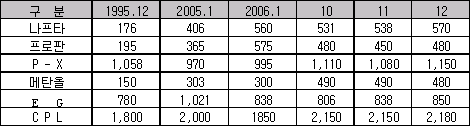 KOIMA, 12월 수입가격 6.6% 상승 … 나프타ㆍ프로판도 대폭 올라 석유화학 원료 수입가격은 2006년 12월 대체적으로 강세를 나타냈다.한국수입업협회(KOIMA)에 따르면, 나프타(Naphtha)는 국제유가 상승에 힘입어 6.0% 상승했고, 프로판은 동절기 수요증가로 6.7% 상승했다. P-X(Para-Xylene)는 미국, 타이완 등 주요 생산기업의 생산량 감소로 수급이 타이트해지면서 6.5% 상승했다. 반면, 메탄올(Methanol)은 중국의 공급량 증가로 가격이 2.0% 하락했다.