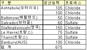 TiO2를 제외한 매출 비중 7%는 Titanium Tetrachloride, Titanium Oxychloride, Titanium Sulfate 등 Titanium Chemicals과 TiO2 나노입자 브랜드 Ultrafine이 차지하고 있다. 인수 의향서 제출은 1월말까지 진행되며 Huntsman, Kronos Worldwide, Blackstone Group, Apollo Management 등이 인수에 관심을 보인 가운데 인수액은 10억달러 수준에 이를 것으로 파악되고 있다. 표, 그래프: | Millennium의 TiO2 생산능력(2006) (단위: 1000M/T) | <화학저널 2007/01/16> |