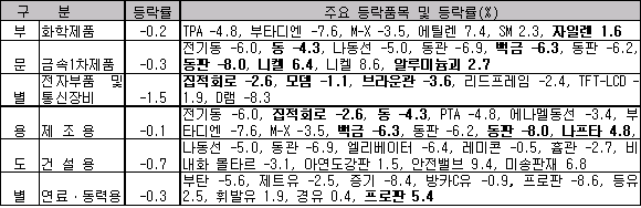또한 연료ㆍ동력용은 국제유가 상승으로 등유, 휘발유, 경유 등은 올랐으나 부탄가스, 제트유, 증기 등이 내려 0.3% 하락했다. 표, 그래프: | 중간재 물가 등락률(2006.12) | <화학저널 2007/01/16> |