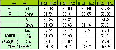 1월16일 50.38달러로 0.31달러 하락 … WTI는 1.78달러 급락 1월16일 국제유가는 사우디 석유장관의 긴급총회 불필요 발언과 미국의 석유제품 재고 증가 예상 소식으로 하락했다.한국석유공사에 따르면, 뉴욕상업거래소(NYMEX)의 WTI(서부텍사스 중질유) 선물유가는 전일대비 배럴당 1.78달러 하락한 51.21달러에, ICE의 Brent 선물유가는 0.86달러 하락한 52.26달러에 거래를 마감했다. Dubai 현물유가도 0.31달러 하락한 50.38달러를 형성했다.