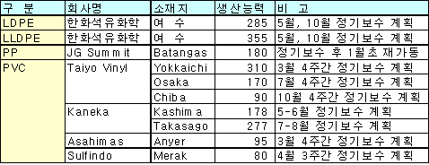 표, 그래프: | 주요 폴리머의 정기보수 일정(2007) | <화학저널 2007/01/18> |
