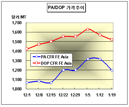 더구나 타이완 UPC(Union Petrochemical)가 1월 중국 Zhuhai 소재 DOP 설비의 생산능력을 14만톤에서 24만톤으로 증설하는 상황에서 다운스트림인 PVC(Polyvinyl Chloride) 가격이 1월17일 CFR FE Asia 톤당 835달러 선에 머물고 있어 DOP 시장에 암운이 드리우고 있다.