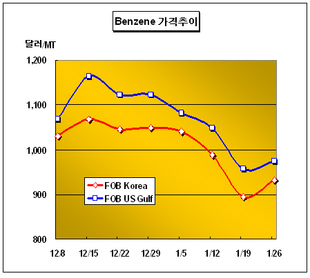 FOB Korea 톤당 933달러 형성 … 중국 Sinopec SM 설비 재가동 벤젠(Benzene) 가격은 1월26일 FOB Korea 톤당 930-935달러로 38달러 상승했다.아시아 벤젠 시장은 국제유가 강세와 중국 Sinopec의 SM(Styrene Monomer) 설비 재가동에 따른 수요 진작으로 톤당 900달러대를 회복했다. 국제유가는 1월26일 WTI 선물가격이 배럴당 55.42달러로 전일대비 1.19달러 상승했으나 두바이유 현물가격은 배럴당 51.52달러로 0.76달러 하락했다. Sinopec Guangzhou Petrochemical의 SM 총 80만톤 2기는 2006년 12월10일 정기보수에 돌입했으며 1월22일 재가동에 들어간 것으로 알려졌다. Sinopec Maoming Petrochemical은 1월16일부터 SM 10만톤 설비의 촉매 교환작업을 실시했으며 1월23일 가동이 재개된 것으로 파악되고 있다. CFR Taiwan 가격은 톤당 955-960달러, FOB SE Asia는 톤당 899-901달러를 형성했다.