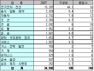 고용 증가수는 전기전자ㆍ전선이 4429명으로 가장 많았고 음식ㆍ담배ㆍ제약(2920명), 조선(천603명), 건설(1447명) 순으로 나타났다. 화학은 석유화학 및 정유를 포함 1653명에 불과했다.