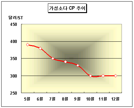주요 수요처인 알루미나(Alumina) 시장에 대한 2007년 상반기 가성소다 계약가격(CP)은 S톤당 255달러로 결정돼 2006년 하반기 대비 50달러 급락한 것으로 알려졌다.